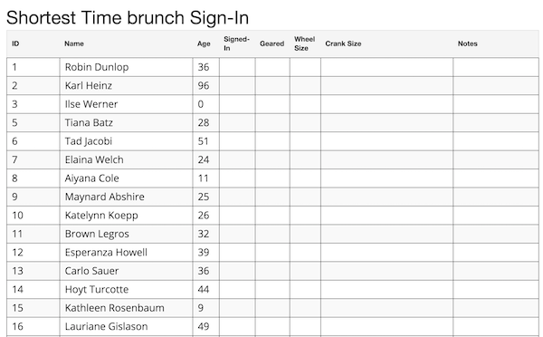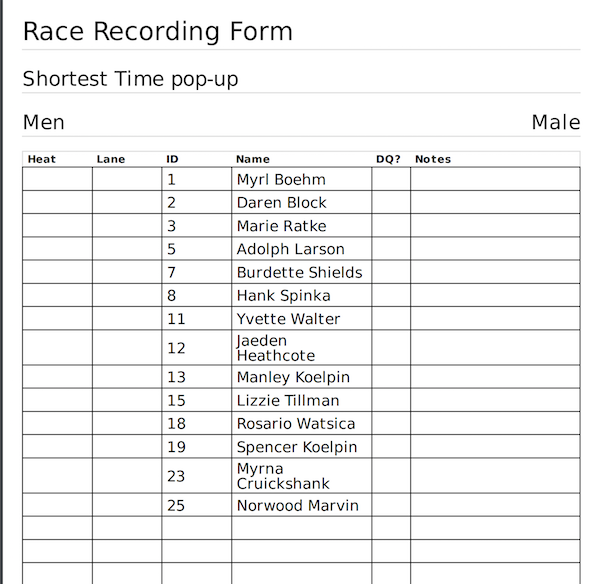 If you want to assign Heats/Lanes to the competitors at the last minute (e.g. at the track) you can print a paper copy of all of the people who are signed up for the event, and then assign them to heats/lanes using a laptop at the track.