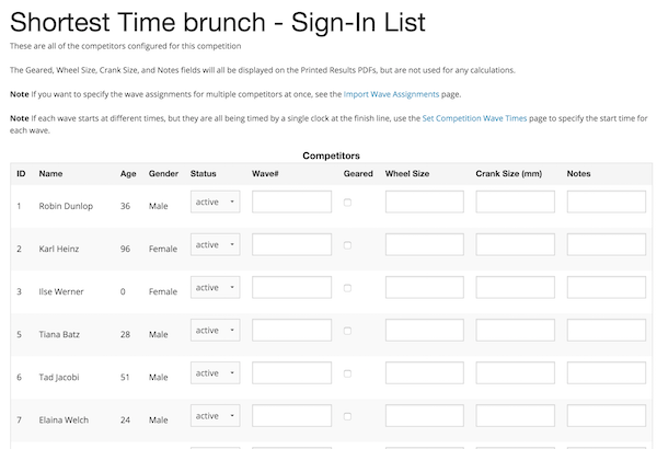 If the competitors all start at the same time, but you want to be able to mark down "Did Not Start" or other details (like crank size, or geared Y/N?) you may want to choose "Sign in List Enabled". If the competitors don't all start at the same time, you will probably have one of the following situations: